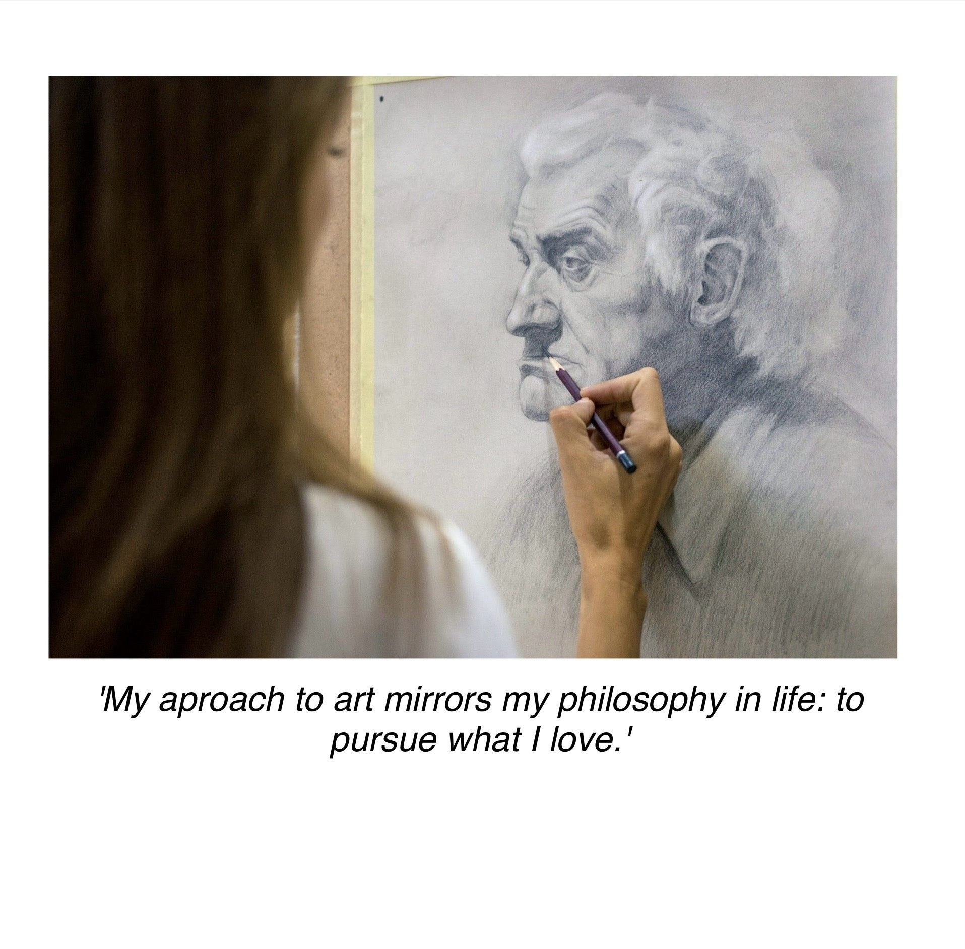 Transitioning to art after a career change in 2017, Laura entered Art College and earned a Master's Degree in Fine Arts. Her work blends photorealistic elements with classical painting approaches.